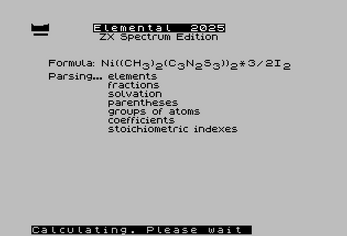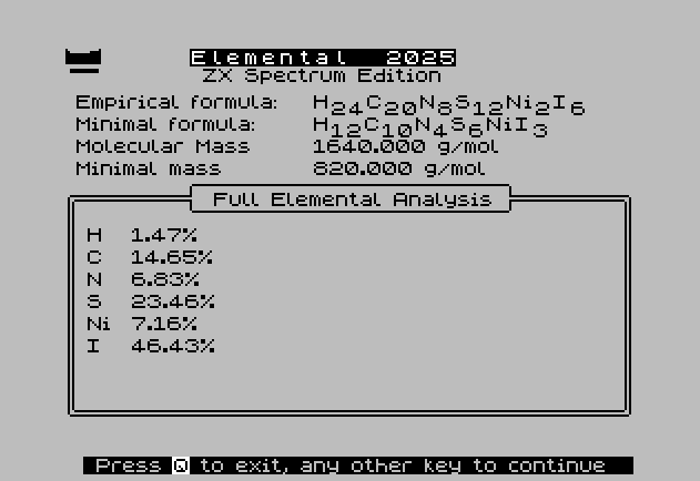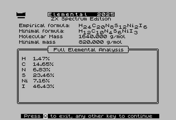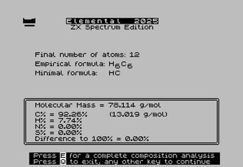 There are many programs that can evaluate the theoretical elemental analysis from a given formula, typically running on Windows or macOS operating systems. There are also some tools available online, more or less accurate. However, no similar software has ever been developed for the ZX Spectrum to date.