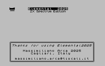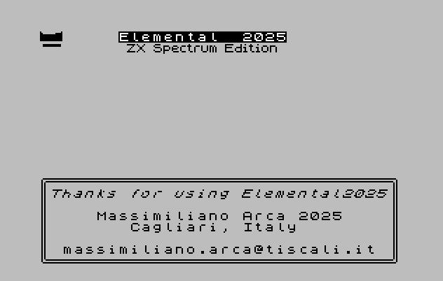Elemental – ZX Spectrum Edition is a ZX Spectrum utility programme. It will run on an authentic ZX Spectrum, ZX Spectrum Next, or any modern clones or emulators. The tape-files and the Z80 screenshot are included in the distribution.